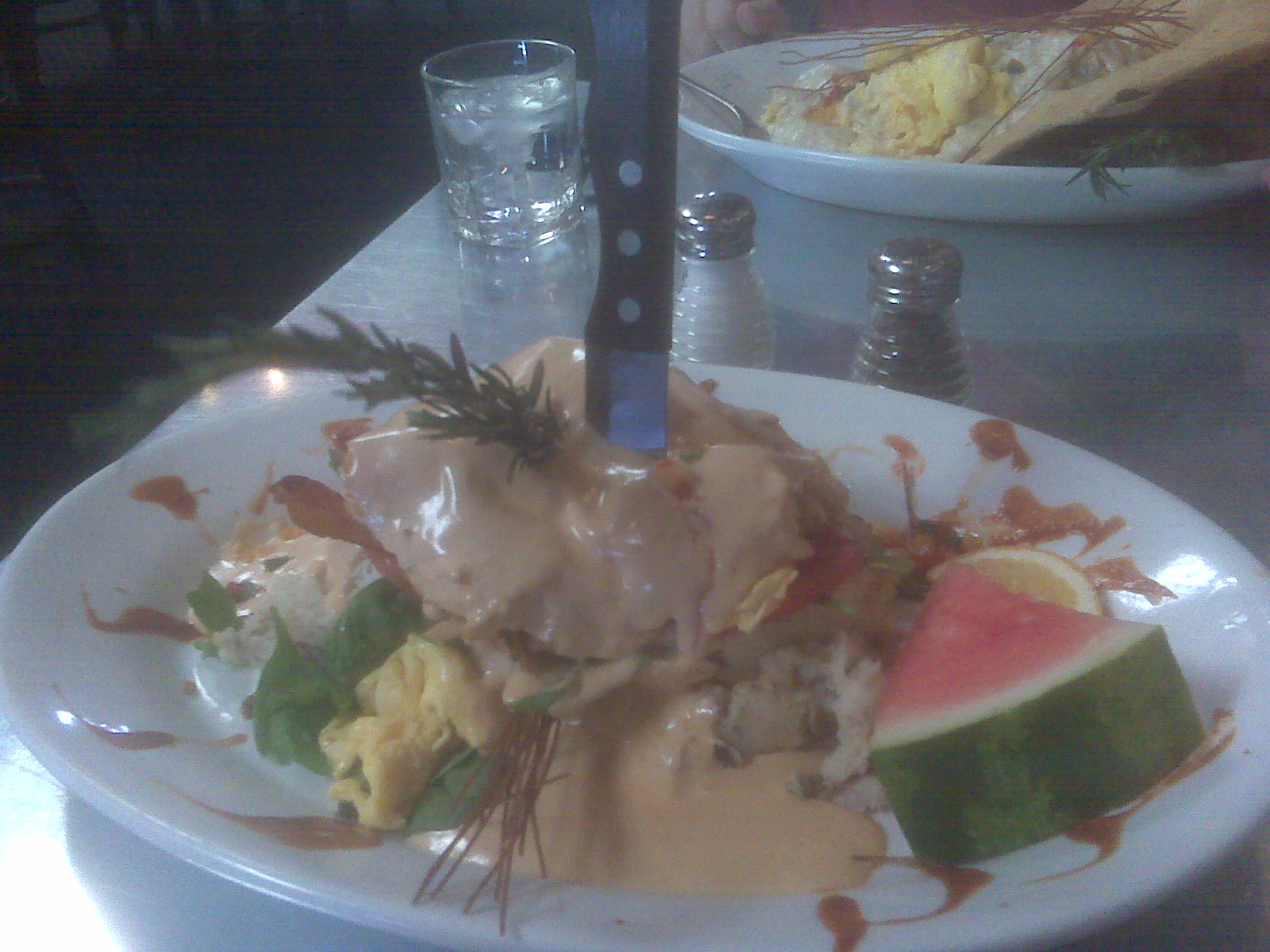 We stopped by here today for brunch. I had read some reviews online about this place. Reminded me of the Iowa Machine Shed a bit. The picture is the Sage Fried Chicken Benedict. As u can see there is enough to feed a small army (notice the scale with the salt & pepper shakers). I would advise that you share a meal and order more drinks. It had biscuit, bacon, spinach, fried chicken, tomato, egg, mashed potatoes, cheese with a chipotle cream sauce over the top. The cream sauce was awesome and the chicken was great. I wanted to try the Chicken & Waffles but we were a bit early and that didn’t start until 11. The service was great but it was busy on a Monday morning around 9:30 so I cannot imagine the weekends. Get their early or sit at the bar and have a bloody Mary (or maria w/tequila).