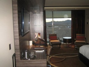 Room. Check in was quick, friendly and efficient. We requested and received a king room with a mountain view on the 15th floor. While it is not Red Rock there is something peaceful about looking out upon the desert with the mountains in the background. The other option is a view almost straight down Las Vegas Boulevard to see the strip and beyond. The bathrooms include a window with an electronic shade so you can see in our out of the bathtub through your room to your view of the mountains or the strip. Fully stocked mini bar, electronic shades, huge bathroom and plenty of room for your clothes.