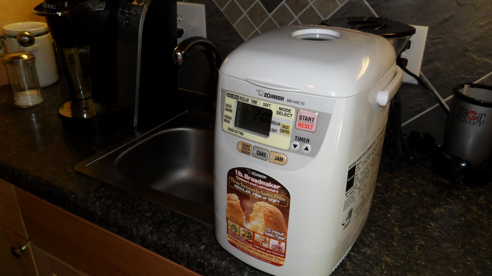 We received our second Zojirushi appliance for our wedding from some close friends. It is so cute and I couldn’t wait to use it. I have had a Zojirushi rice cooker for a few years and it is one of my favorite appliances. In the age of high fructose corn syrup in almost everything (Yes.. Including your bread.) What a great way to control what goes into your bread without having to destroy the kitchen. It took me 5 minutes to add the ingredients for basic white bread and about 3 hours to cook. It makes one mini loaf good for about 6-8 slices. Of course there are a ton of variations but I thought basic was the best way to start. When it was done the whole house smelled great and the bread was awesome. It has already found a permanant place on the counter.