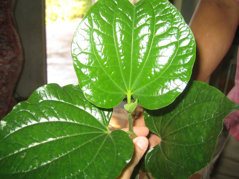 Interestingly enough in 2007 I went to Vietnam with my father. We were visiting some relatives in his hometown just north of Saigon. We found wild batel leaves growing in the yard. In the picture below my dad surprised me with a batel plant he had just pulled out of his cousins back yard in which he kept insisting it was “good, good.”