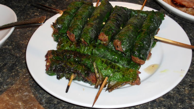 This meal consisted of seven courses of beef all prepared in different ways. They were all very tasty but one out them stood out to me because of its wonderful flavor. It was the Bo la lot. Curry spiced ground beef wrapped in some kind of leaf and grilled over charcoal. At first the leaf looked like a grape leaf but had a flavor of its own. The leaf turned out to be the wild batel leaf. Learn more about it here.