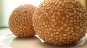 Especially ones purchased at Asian markets. These little freshly fried balls of wonder are amazing. I can always count on a whole container of these tasty sesame balls greeting me as I check out. Chad and I both love them so I always score brownie points when I bring these home. They are made with glutenous rice flower, sweet bean paste and of course sesame seeds. The are best when they are still warm. They have an amazing roasted sesame flavor, an interesting chewy texture due to the glutenous rice flower and a sweet surprise in the middle.