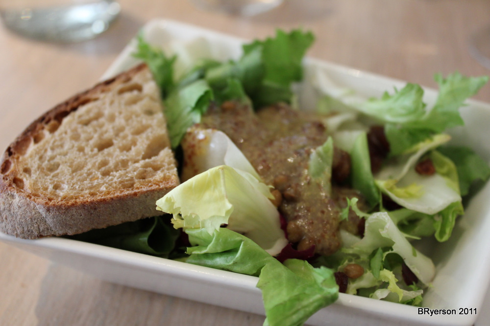 Unexpectedly, we received a fresh salad with a whole grain mustard vinaigrette and a small piece of Poilane sourdough to start. The vinaigrette was fresh and tangy. The bread was soft and crusty.