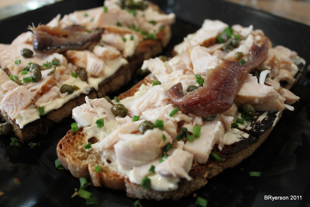 Tartine Poulet. It was excellent! The chicken was moist and fresh. The garlic mayo added a nice flavor. The capers and anchovy added the salt and the bread was toasted just right. The Tartine Sardine was also very fresh and full of flavor.