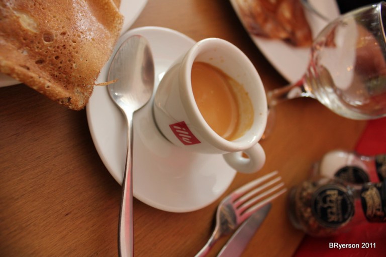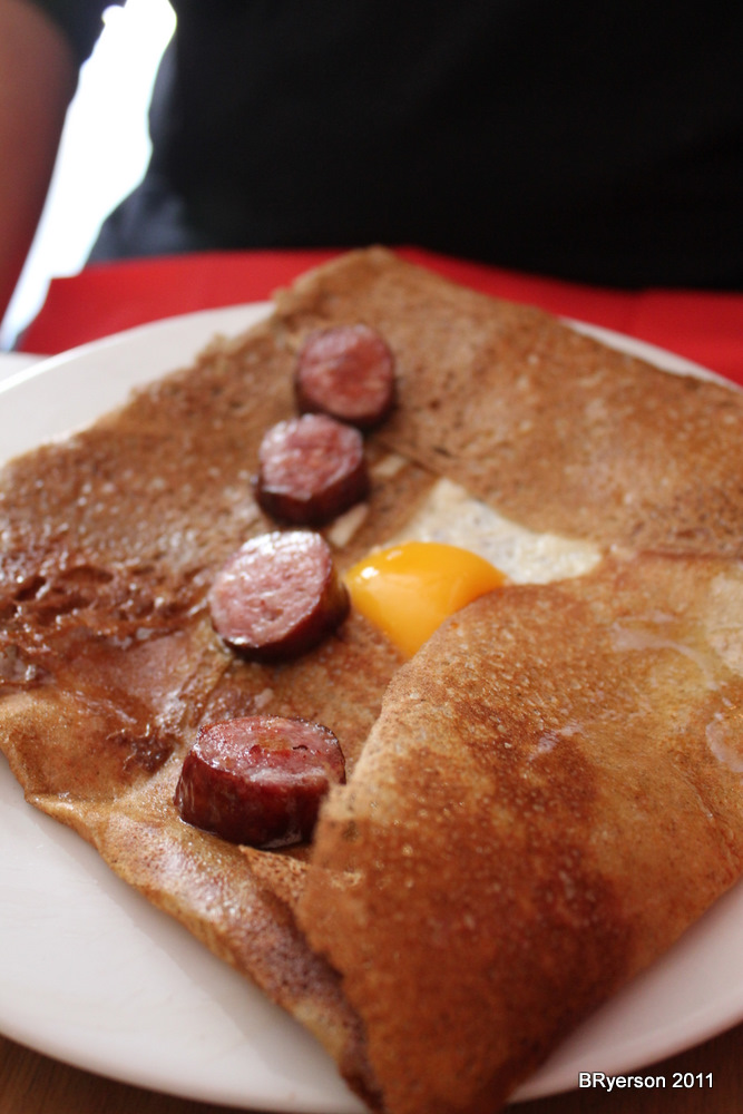 Lucky for us our server was from Australia! She initially spoke in French, but when she saw that we were hopeless she took pity on us and switched to English. Thank Goodness! She informed us of the specials. She advised that we could both eat a savory crêpe and still have enough room for a desert crêpe each. I think she was being nice to the big American boys, but we were actually really full after this meal. We decided on the leek, egg and cheese special along with the andouille sausage and egg crêpes. After researching a bit more I think we probably had buckwheat gallettes instead of crêpes but they should have just been called delicious!