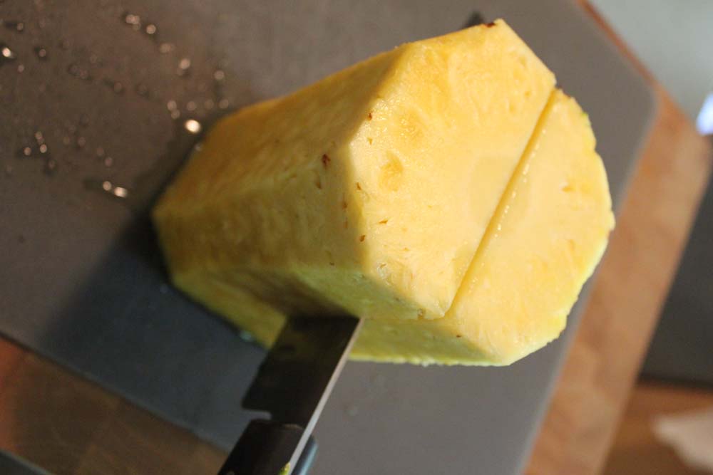 3. Cut Four Sides – Set the pineapple on its bottom and cut the sides. Cut in about a 1/4 of an inch or so to fully cut the eyes out of the flesh of the pineapple. You might feel like you are wasting some of the pineapple but it will save you time picking out eyes later. If on your first cut you don’t cut out the eyes cut a little deeper.