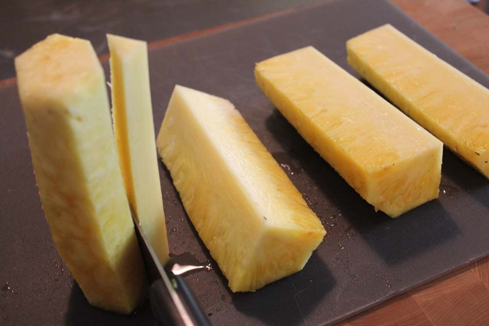8. Stand Up Quarter and Cut Out Center – The center core of the pineapple is fibrous and need to cut it out. Cut 1/4 to 1/2 inch of the core off of each quarter. Cut all four sections the same.