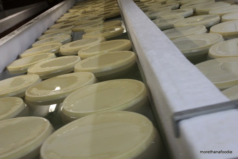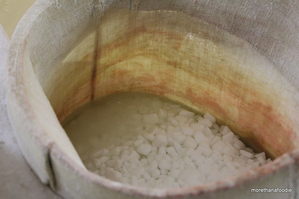 After a few days the wheels are removed from the mold. It is then put in one of 12 vats to be salted. Each wheel is brined in the salt for 30 days before moving to the maturation room.