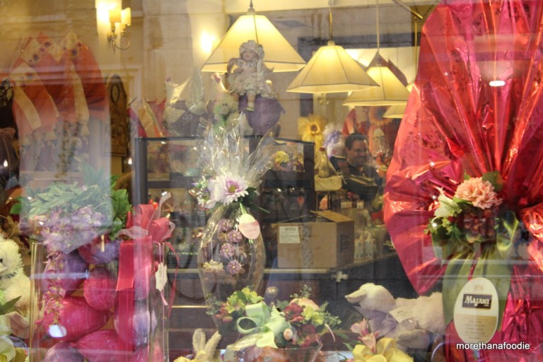 Here is a picture of the store from the outside. At first glance I didn’t really care for the picture, but after looking at it a few times I decided to include it. As you can see by the display in the window, we visited right before Easter. If you look close you can see Chad paying for our chocolates.