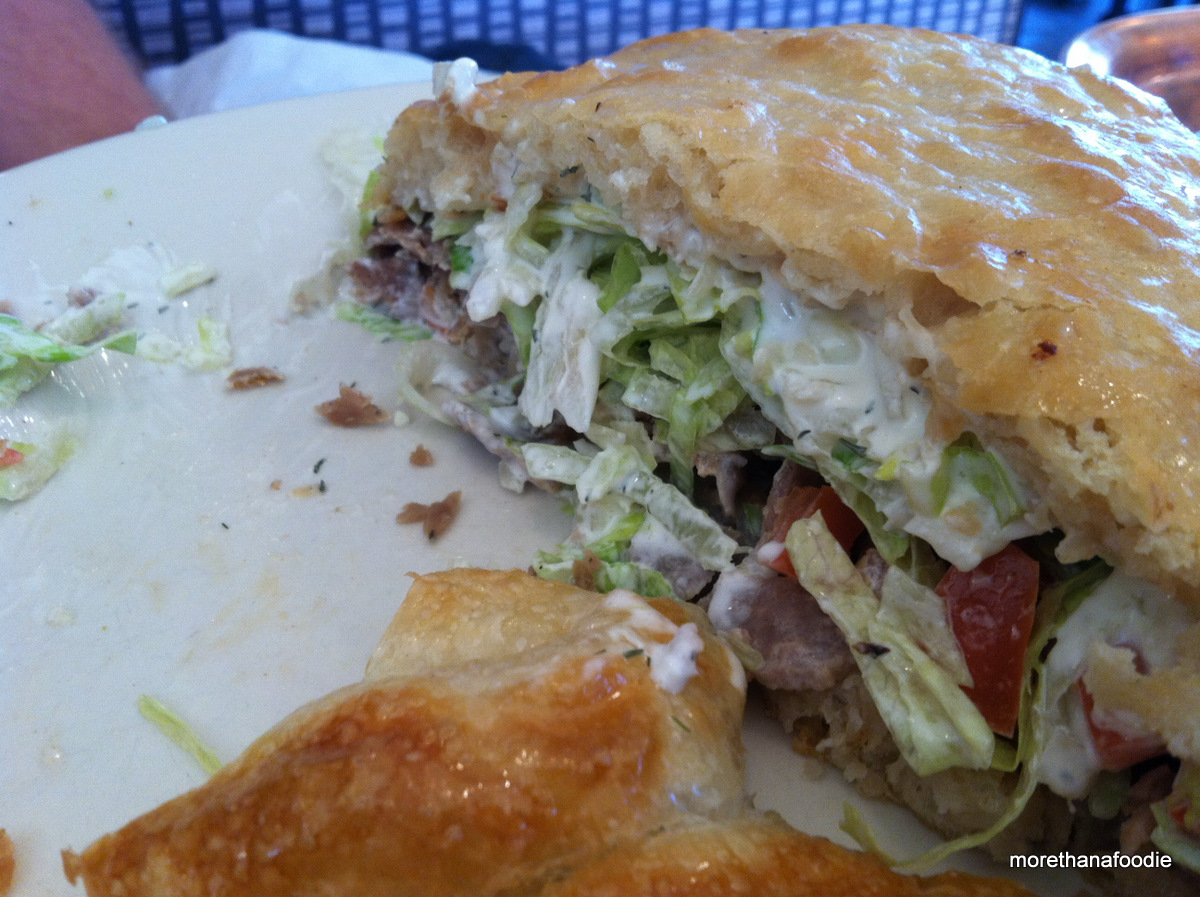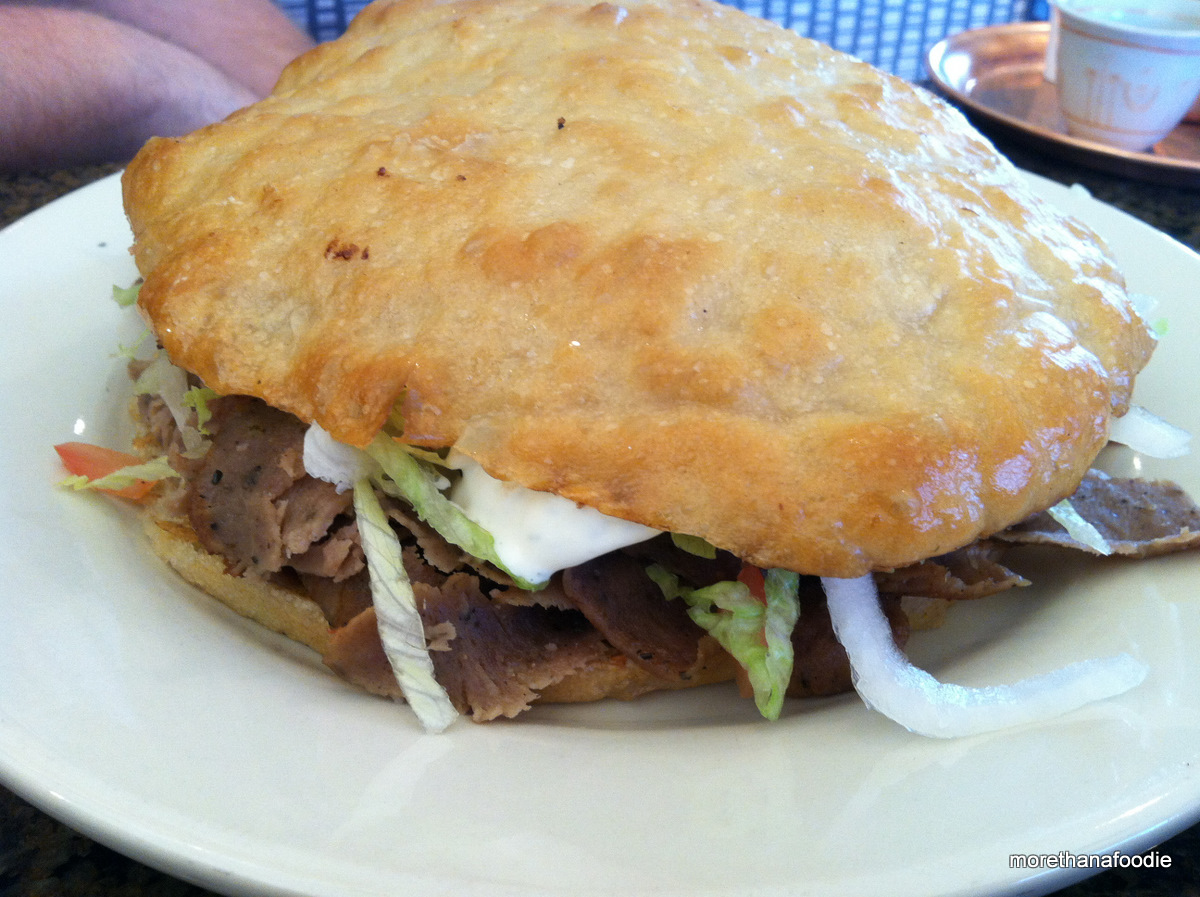 I ordered the Zeljanica. Chad ordered the Bosnian Gyro. The Zeljanica was phyllo dough stuffed with spinach and cheese. The Bosnian Gyro was served on lepina filled with beef gyro meat, lettuce, tomato, onions, and Tzatziki sauce.