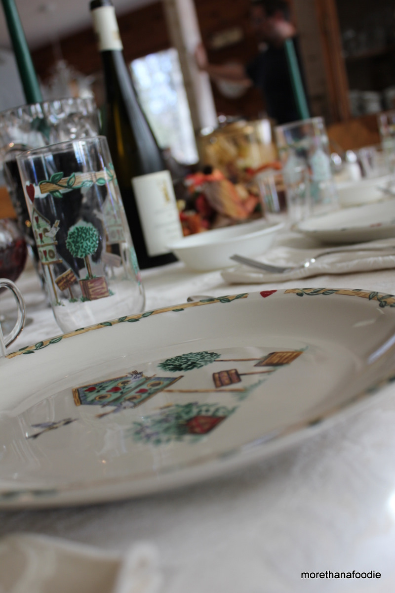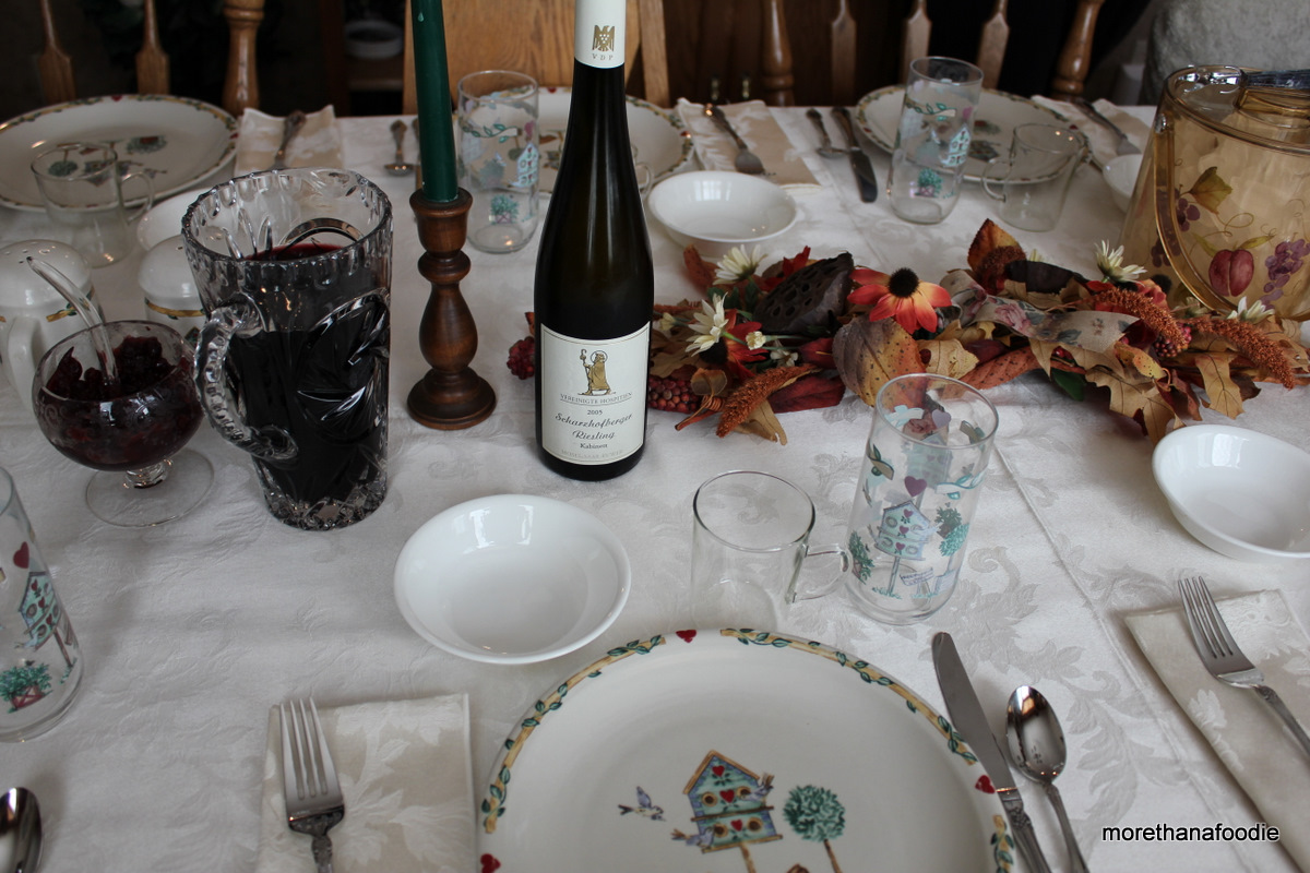 Thanksgiving table with a nice La Granja Tempranillo and a Scharzhofberger Riesling.