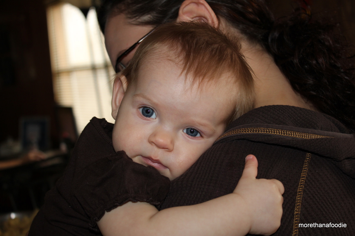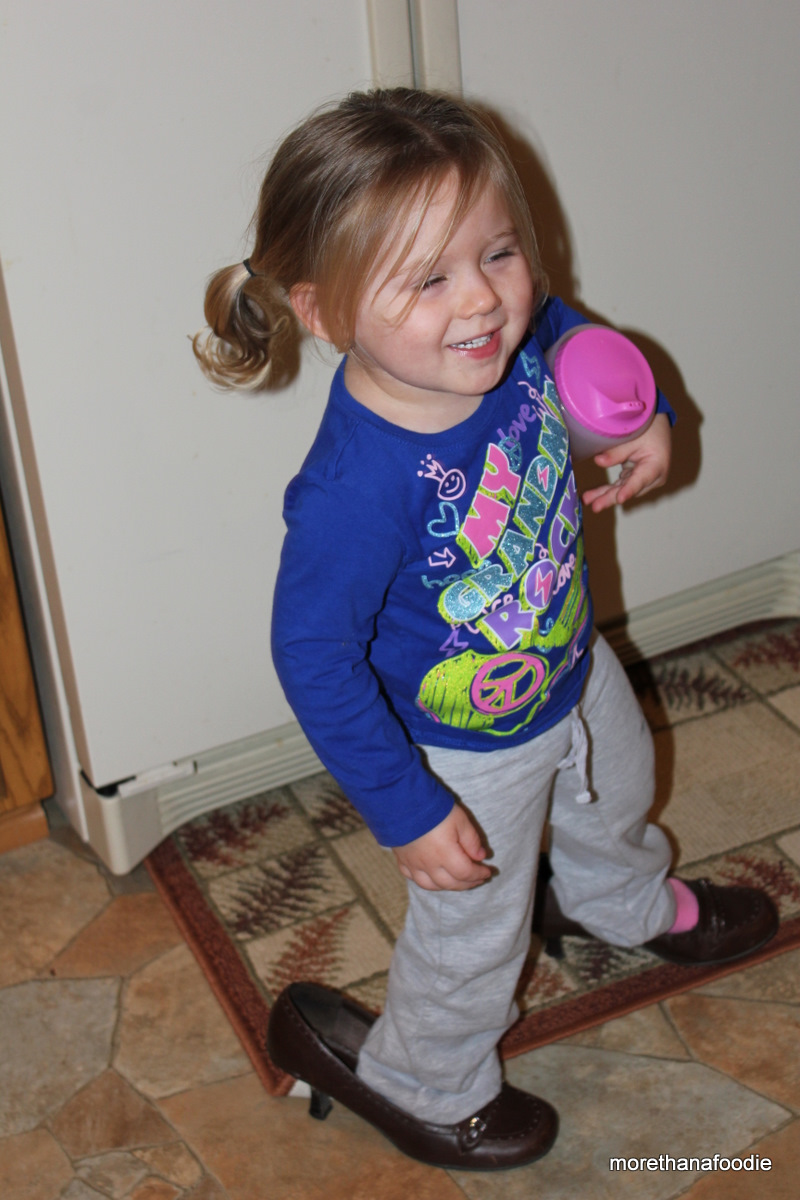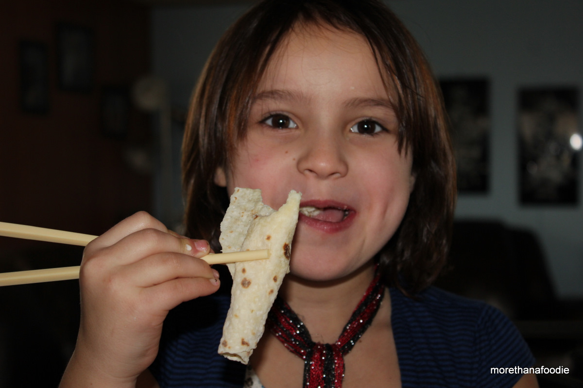 Kaylie eating lefse with chopsticks. She is becoming very proficient with them.