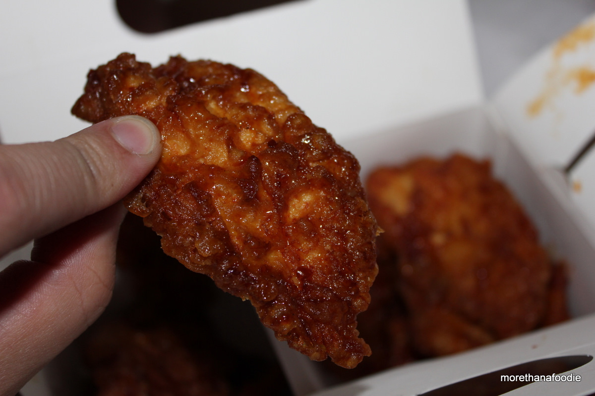 The chicken is fried fresh for each order. I am not quite sure how they do it, but I have read it involves several steps. Unseasoned fresh chicken, dusting of flour (rice?), thin coating of batter, cooking at lower temps, shaking the partially cooked chicken, re-frying to crispy perfection, and then tossing in the delectable sauces.