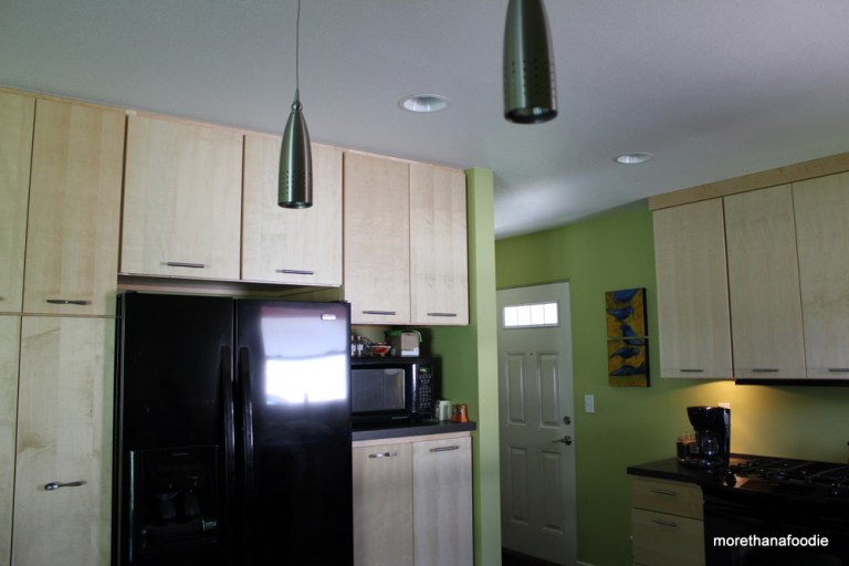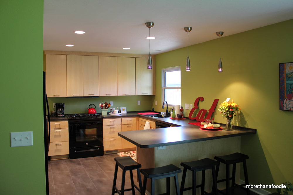 Maple cabinets with whimsical touches. If you look carefully you will see the spoon, knife, and fork pulls on the cabinets.