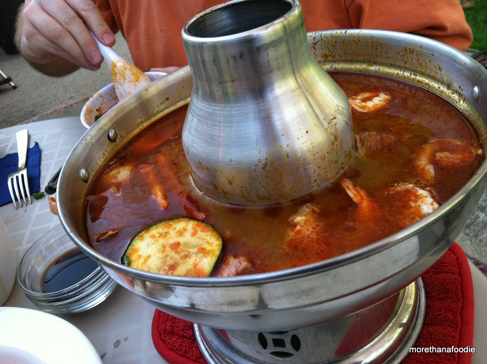 To use the hot pot, you just need to fill the center of the pot with a few pieces of hot charcoal. Then add your prepared broth. The broth base I used for this pot was a Tom Yum Sour Shrimp paste. Purchasing a paste can save you a lot of time and makes the prep of the broth a snap. There are several varieties available at your local Asian market. Spicy, sweet, sour, salty all in one handy jar. This specific Tom Yum has a mix of lemongrass, galanga (another form of ginger), chilies, sugar, lime leaf, salt, and some oil. I used Lucky Coin Brand. I mixed three spoonfuls of paste with every three cups of water. I also added a bit more chili for added spice. Heat the mixture to a boil on your stove and then reduce heat to keep hot. When ready, carefully add to the pot that has the charcoal in the center.