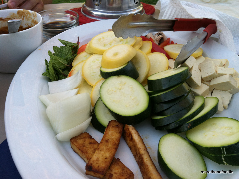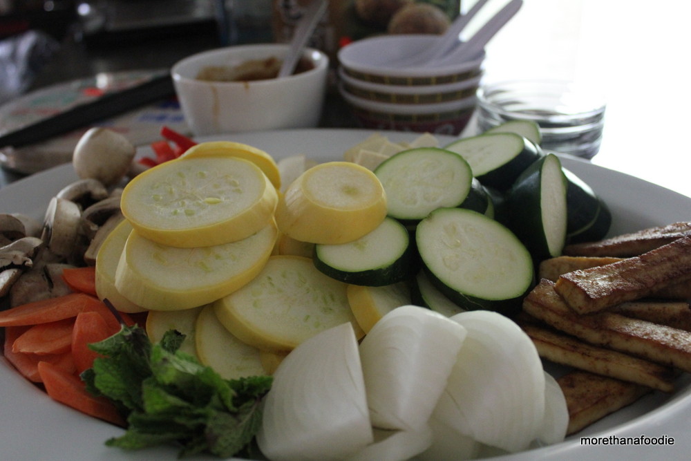 The most time-consuming part of this meal is the preparation of all the vegetables, meat, noodles, and sauces. I just used what was fresh and available at my local grocery store or Asian market: squash, zucchini, carrots, onion, mint, mushroom, red pepper, and tofu.