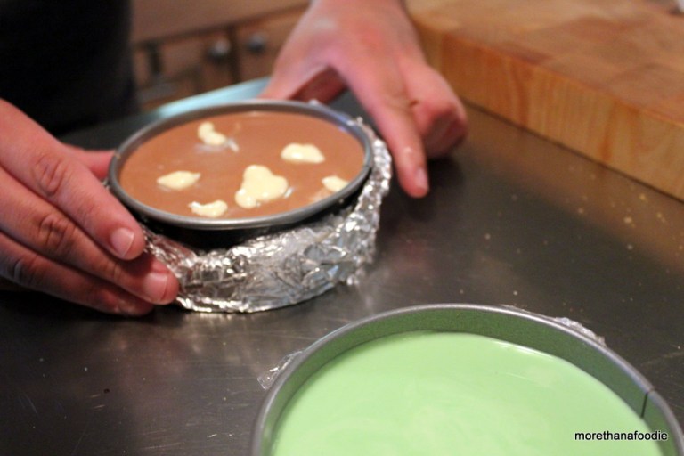 Line the Springform Pan – Ensure you cover the bottom of the springform pan with aluminium foil and then a good plastic wrap. The plastic wrap may be a bit foreign to use for some, but it is used a lot in commercial kitchens. The wrap will be just fine and will not melt into the cheesecake base. It helps create a barrier to the water bath needed to cook the cheesecake.