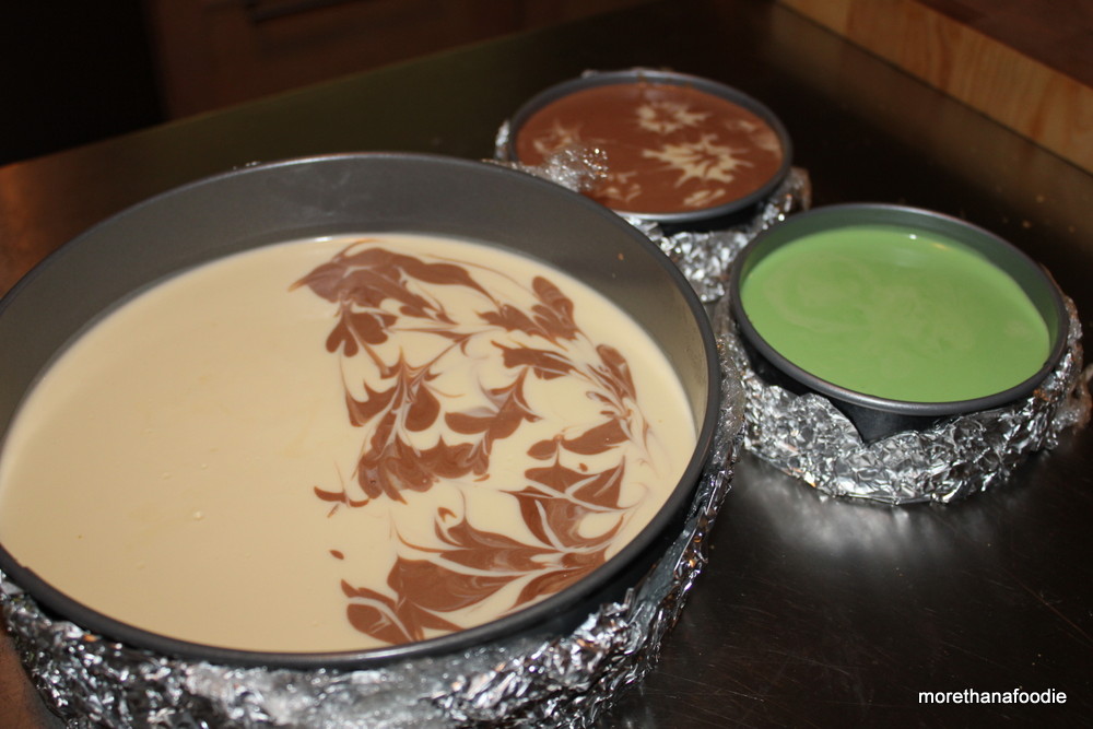 Swirls – Pull aside some batter and add chocolate, food coloring, or another type of cheesecake batter (blackberry for instance). Add little drops to the top of the cheesecake and swirl with toothpicks. Viola!