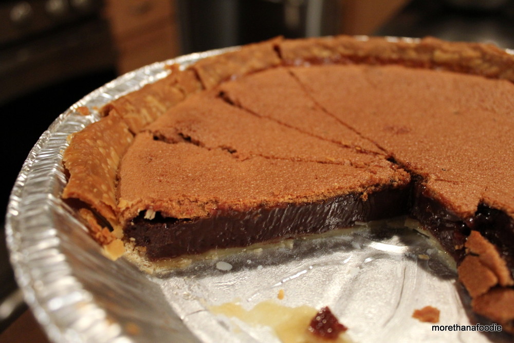 After making this pie, I compared my results to the website. They didn’t quite look the same. I thought there may have been a problem with how I mixed the ingredients. A recommendation I found on the site was to whisk the cocoa into the sugar and salt, add the vanilla and melted butter, then add the eggs one at a time and whisk after each egg. Lastly, whisk in the evaporated milk. I did not do this and perhaps this is why the top layer of my pie looked different from the F&W site. Oh well, regardless, it was damn tasty!