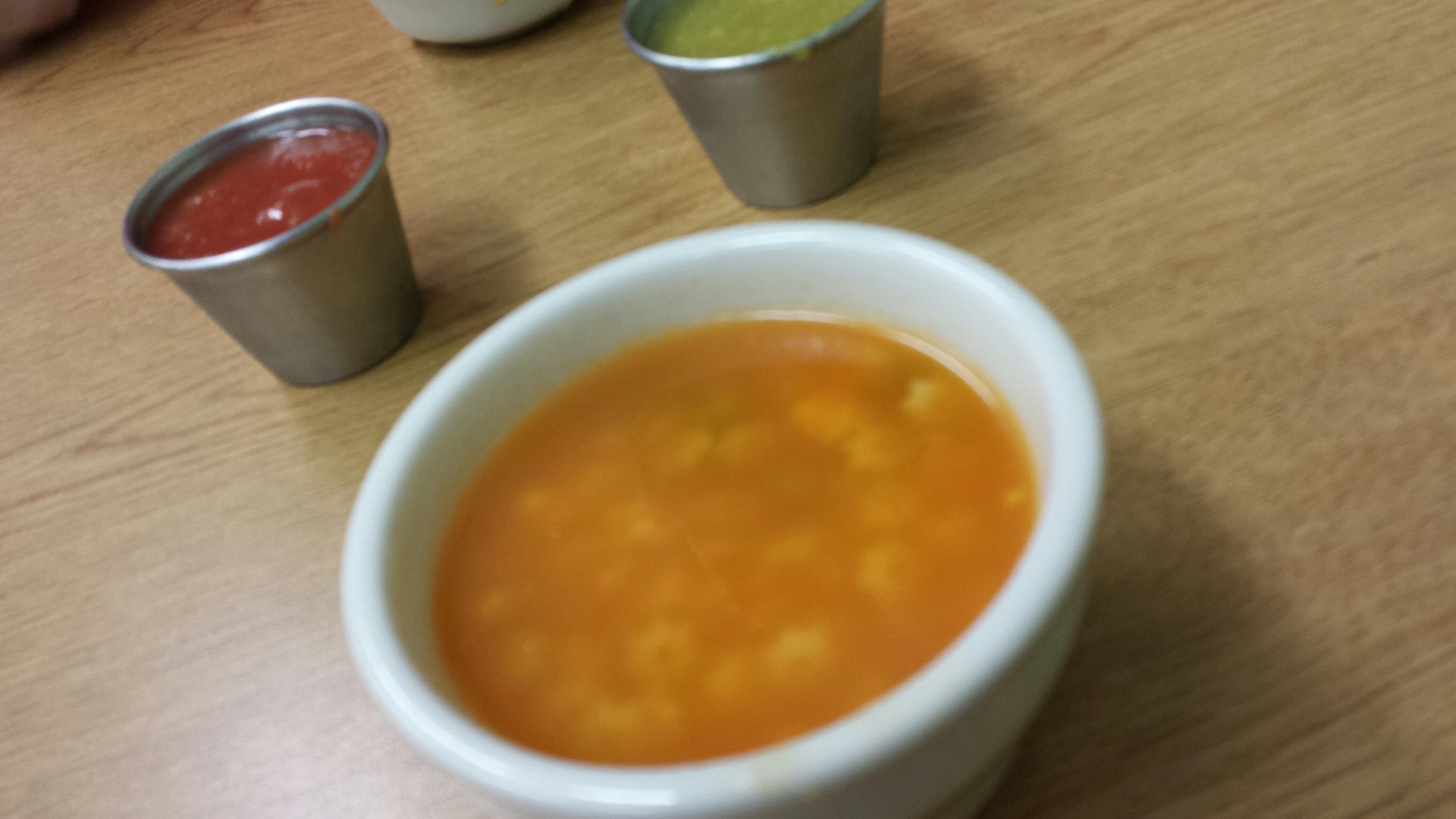 We were served a small cup of their house made soup along with red and green salsa to add your preferred level of spiciness to the soup. The soup was tomato-ey with some vegetables, and small pieces of star pasta. If it wasn’t for the sauces, this soup would be forgettable. However, with the addition of customizing the level of spice to your needs it was a nice addition to the beginning of our lunch.