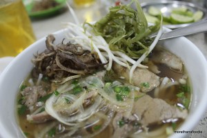 bun bo hue with banana leaf, bean sprout, and rau moung