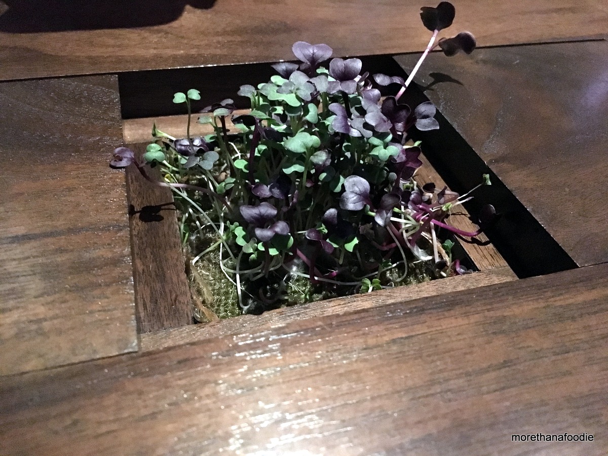 Inspecting the table, I knew there was something mechanical about it, but I couldn’t figure it out completely. The next thing I knew, the server had a wooden covered magnet, removing the center piece of the table. He inserted a garden of microgreens grown in-house especially for us by the chef’s. How nice! The microgreens were later used in a rabbit dish.