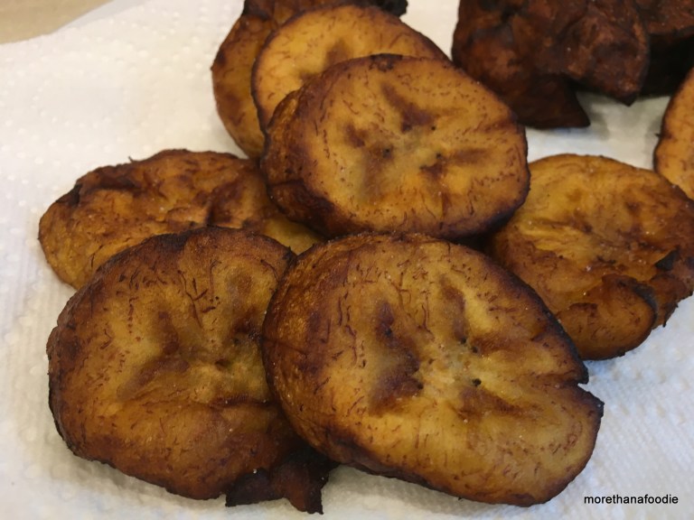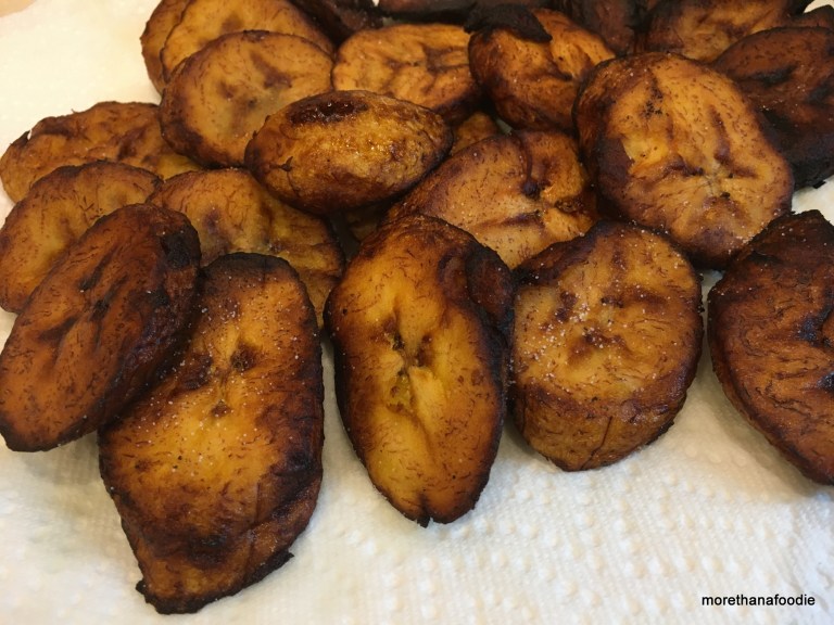 I pan-fried mine in a cast iron pan. Medium-high heat, careful not to burn as the sugars caramelize quickly. Ensure to prep some paper towels to drain. Salt to finish the fried plantains.
