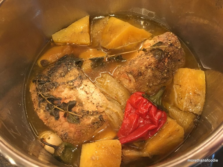 I used the recipe that came with my Instapot for the pulled kalua pork, but I decided I needed to add some more ingredients from the fridge. Peppers, onion, pineapple, garlic, oregano, and some parsley. Why not?