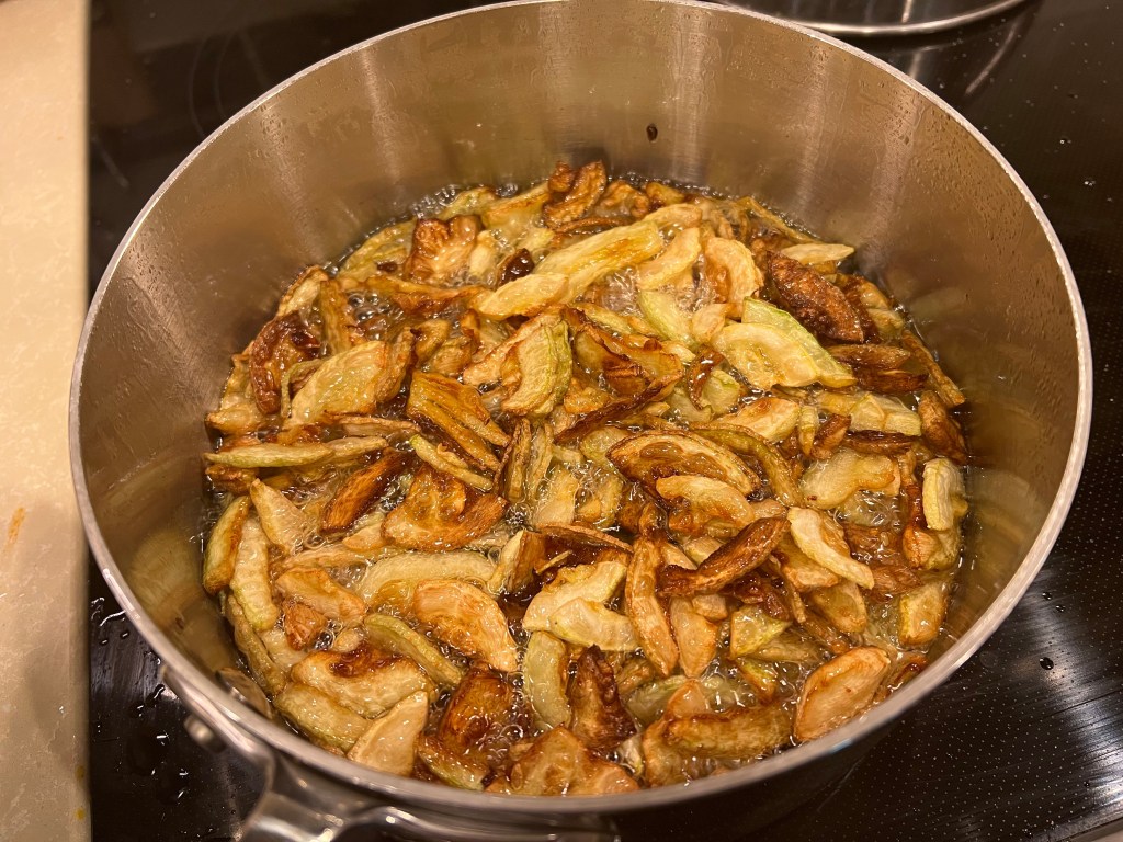 1. Take thinly sliced zucchini rounds and deep-fry in sunflower oil until golden (or even slightly burnt).