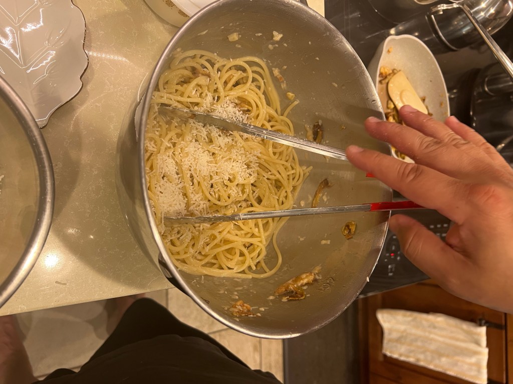 5. Drain the spaghetti and add to the pan with the zucchini. Remove the pan from the heat, add a couple of handfuls of grated Parmigiano-Reggiano and toss everything together well.