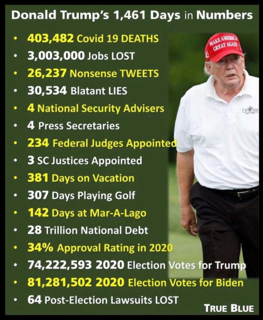 On top of this, navigating a deadly, global pandemic which killed millions across the world. Almost half a million Americans died from COVID-19 under Donald Trump’s time in office, not to mention the continued aftermath. The pandemic had playbooks and controls built from science and experience put aside. We had an institutional memory from the Spanish Flu pandemic from the post-World War I era. We learn, remember and question only what we want to question. This is what makes us independent, autonomous beings with our own minds. Our own facts. Our own inherent ability to make decisions and/or take a stance on a position for ourselves. It blows my mind to think people still think Donald J. Trump should still hold office.