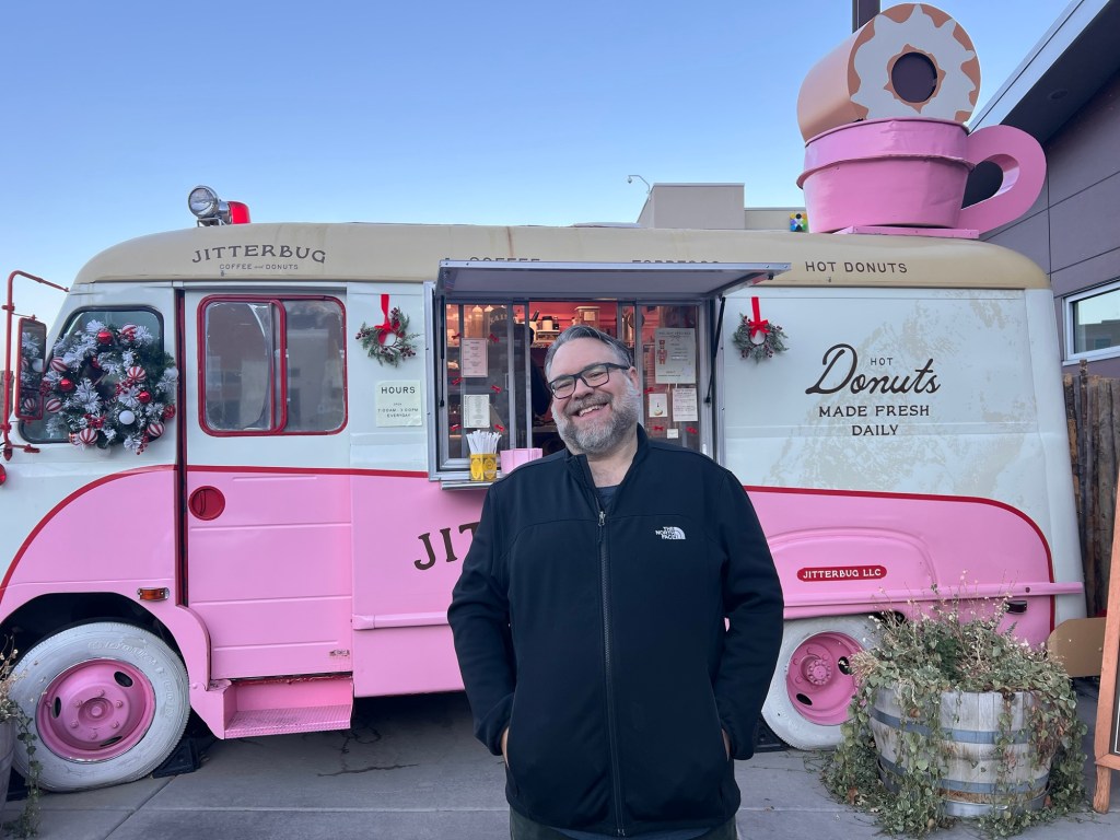 The Chad, waiting for his morning coffee. I was a little crabby on this day driving through the beautiful mountains of Utah on our way through Wyoming.
