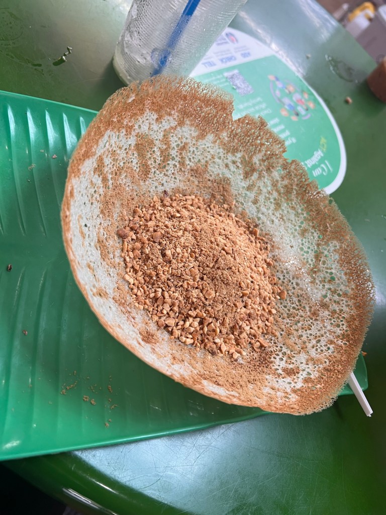 We shared a roasted meat platter—the pork was outstanding—along with fresh sugarcane juice and a rich three-layer coffee. A peanut pancake made by a Vietnamese woman was a standout, and we grabbed noodles and pork to-go before Chad headed back to the hotel.